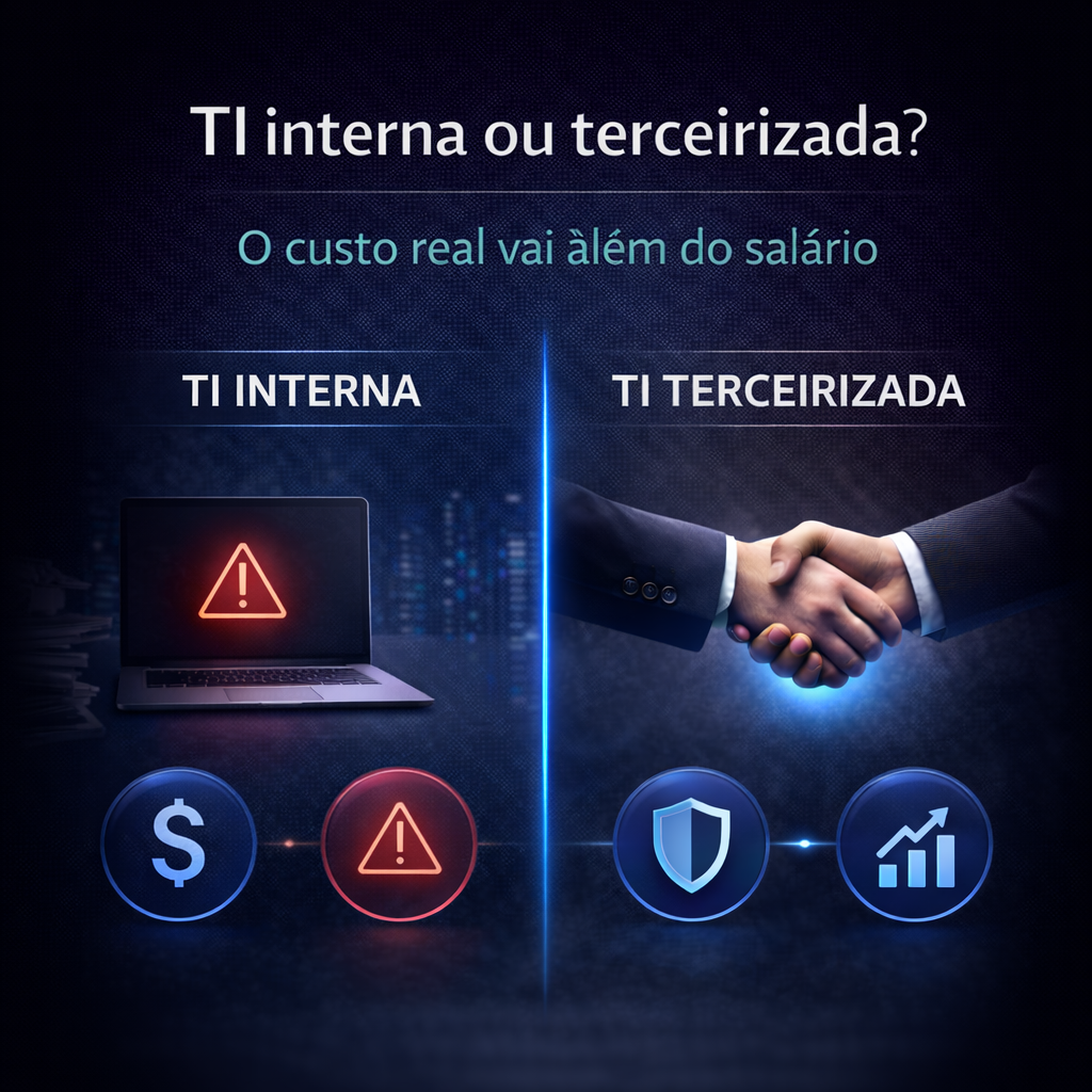 À medida que a empresa cresce, a TI deixa de ser suporte pontual e passa a ser infraestrutura crítica. Nesse momento, surge a dúvida: montar equipe interna ou terceirizar?